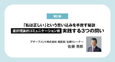 5名の取り組みから見えてきた共通点は、「正しさ」を手放し、相手を理解しようとする姿勢でした。ここからは、「正しさ」を手放し、選択理論的コミュニケーション術を使うために大切な考え方について、アチーブメント主席トレーナーの佐藤英郎よりお伝えします。 〝正しさ〟を押し付ける相手と押し付けない相手がいる!? […]